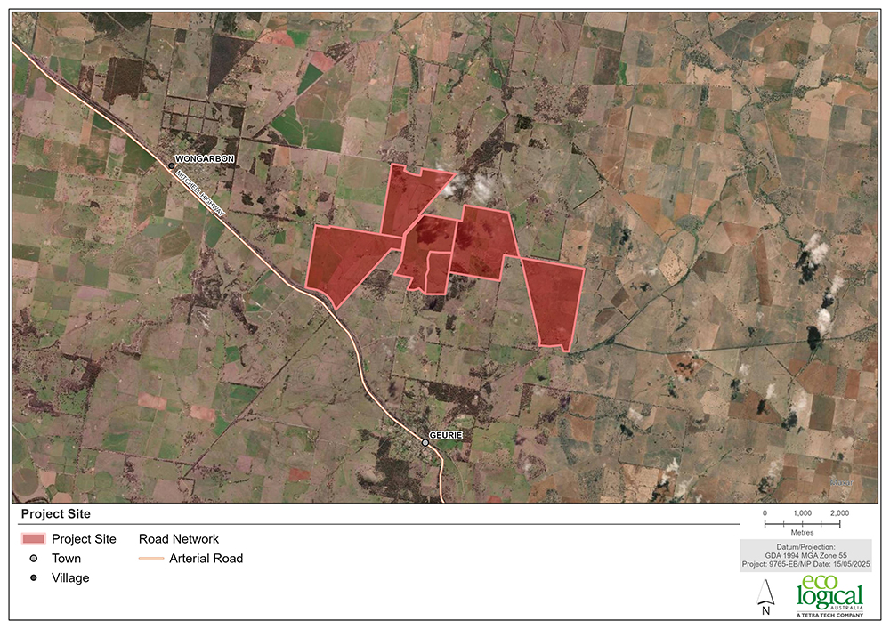 The Project site comprises six lots extending over an area of approximately 1,322 hectares (ha) within the Dubbo Regional Council Local Government Area (LGA), New South Wales.  The site is located approximately 4 km north of the village of Geurie, 4 km east of Wongarbon, 21 km south-east of Dubbo and 21 km north-west of Wellington.